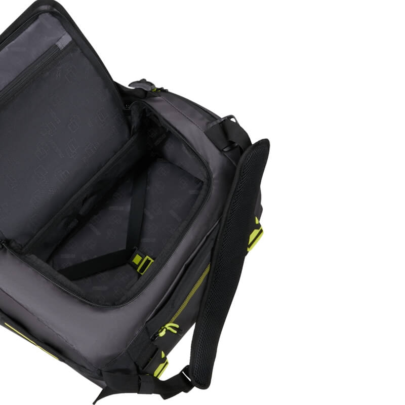 O saco de viagem tamanho M da coleção Urban Track é revestido, apresenta um design contemporâneo e funcional, ideal para quem procura praticidade sem abdicar de estilo. Com uma estética urbana marcada pela combinação de tons escuros e apontamentos em amarelo fluorescente, este modelo destaca-se pelo seu visual moderno e dinâmico.