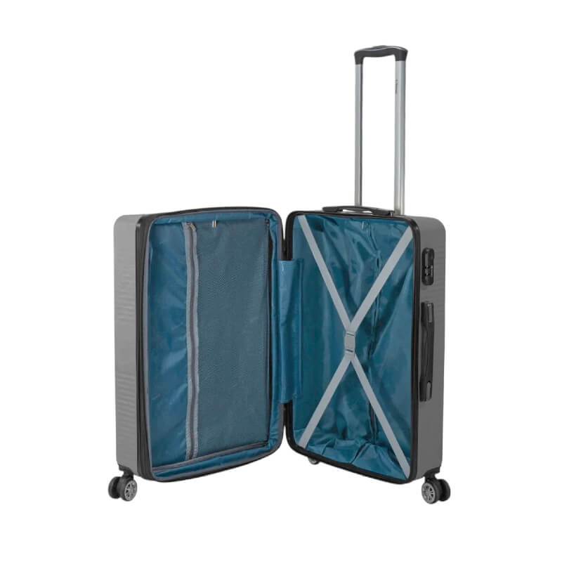 No interior da mala, há uma divisão inteligente. Uma metade com cintas elásticas que permitem ajustar a roupa, mantendo-a no lugar durante a viagem. A outra metade possui uma divisória com bolsos, o que facilita a organização dos seus objetos pessoais, mantendo-os separados e de fácil acesso.