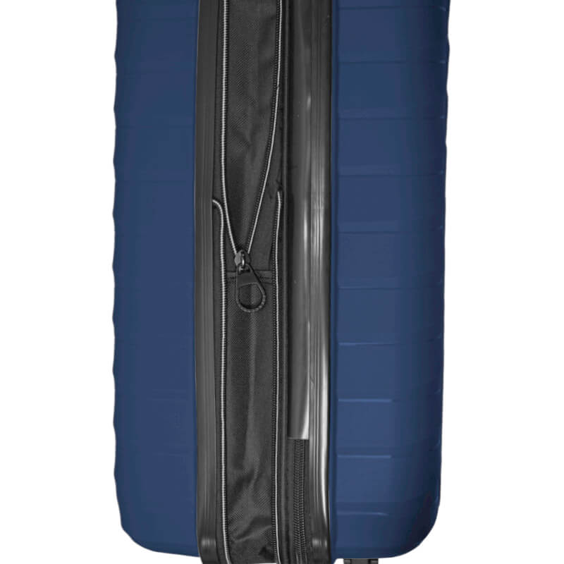 No interior da mala, há uma divisão inteligente. Uma metade com cintas elásticas que permitem ajustar a roupa, mantendo-a no lugar durante a viagem. A outra metade possui uma divisória com bolsos, o que facilita a organização dos seus objetos pessoais, mantendo-os separados e de fácil acesso.