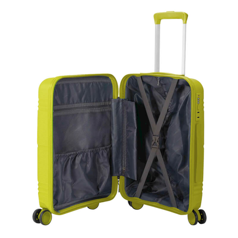 No interior da mala, há uma divisão inteligente. Uma metade com cintas elásticas que permitem ajustar a roupa, mantendo-a no lugar durante a viagem. A outra metade possui uma divisória com bolsos, o que facilita a organização dos seus objetos pessoais, mantendo-os separados e de fácil acesso.