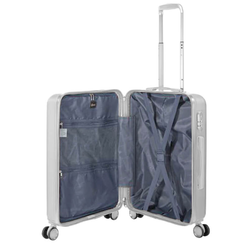 No interior da mala, há uma divisão inteligente. Uma metade com cintas elásticas que permitem ajustar a roupa, mantendo-a no lugar durante a viagem. A outra metade possui uma divisória com bolsos, o que facilita a organização dos seus objetos pessoais, mantendo-os separados e de fácil acesso.