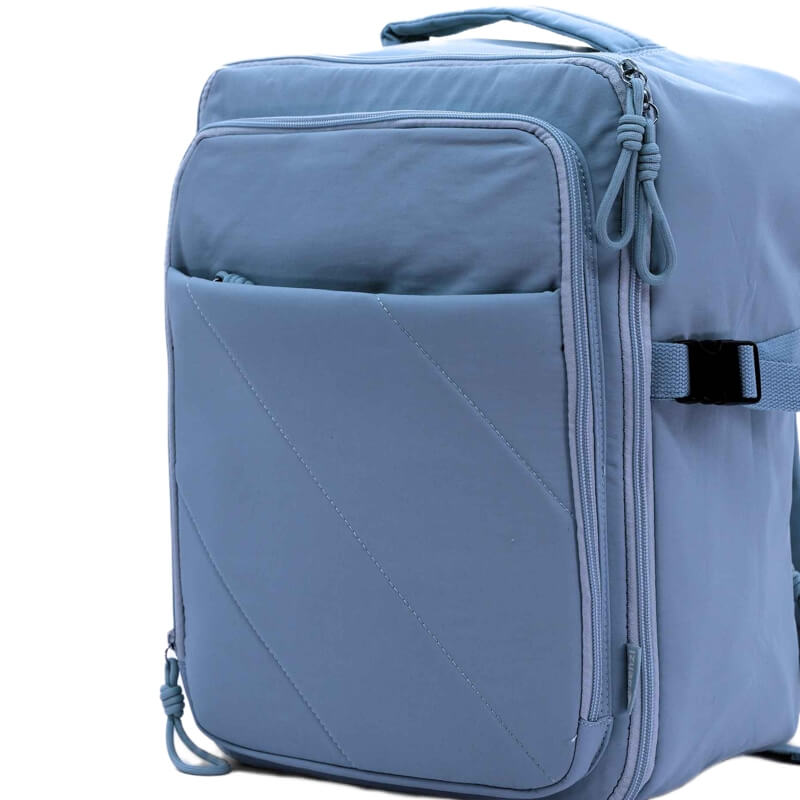 O design aposta na cor azul Jeans, que lhe confere um aspeto moderno, discreto e elegante. O compartimento principal é surpreendentemente amplo para o formato da mochila, oferecendo espaço suficiente para roupa e acessórios de viagem. As correias de compressão permitem apertar a mochila quando está cheia para manter o conteúdo mais estável, ou reduzir o volume quando está menos carregada, tornando-a mais compacta e confortável de transportar.