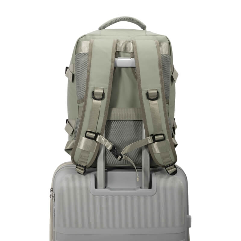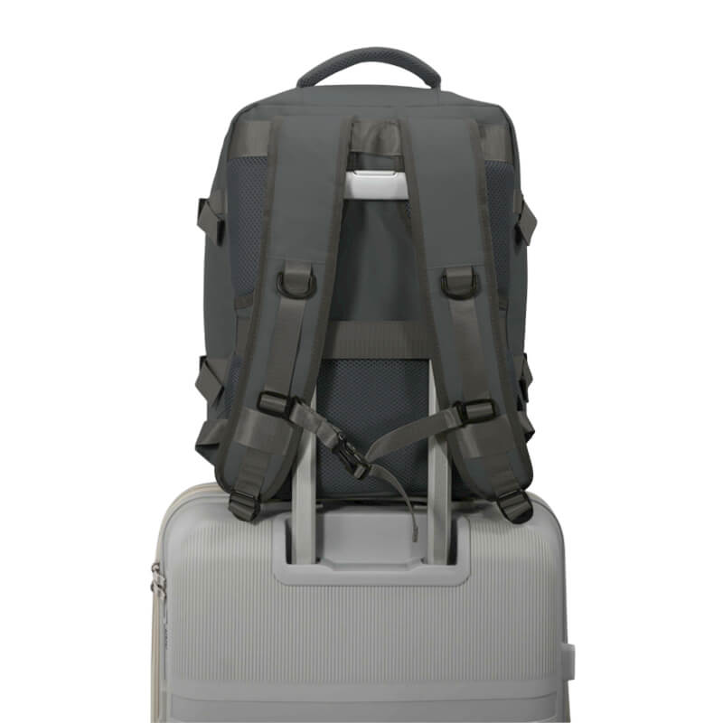 Com dimensões 40×30×20 cm, esta mochila cumpre os requisitos das companhias aéreas mais exigentes no que toca à bagagem gratuita. Pode ser transportada gratuitamente a bordo em voos da Ryanair, Vueling e Wizz Air, encaixando perfeitamente sob o assento à frente do passageiro. Isso faz dela uma excelente escolha para viagens rápidas, escapadinhas de fim de semana ou como bagagem pessoal adicional.