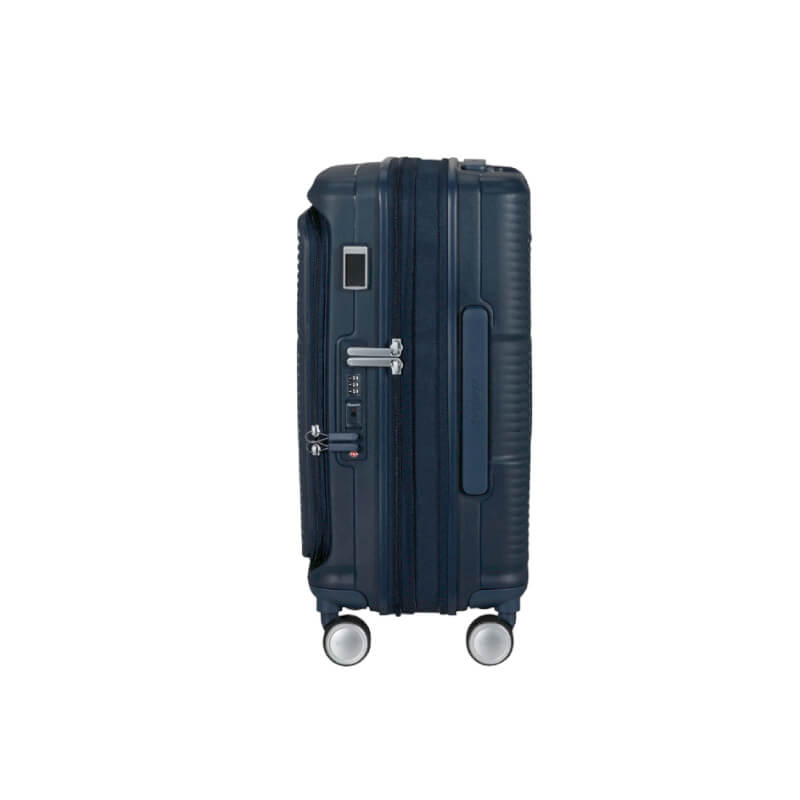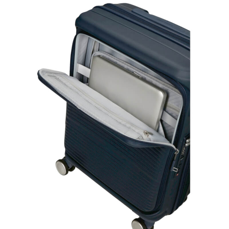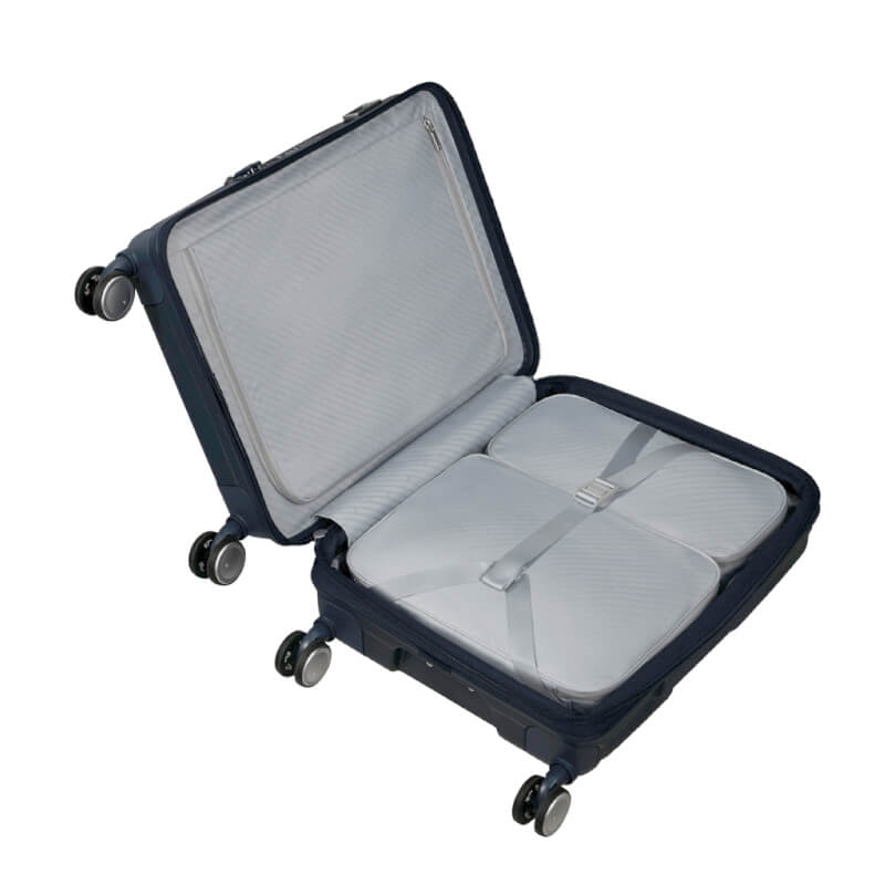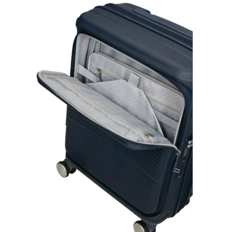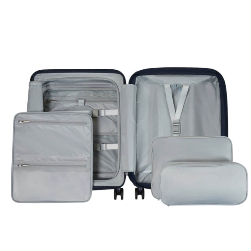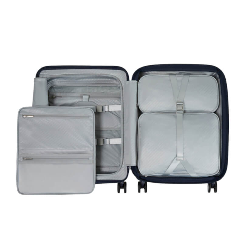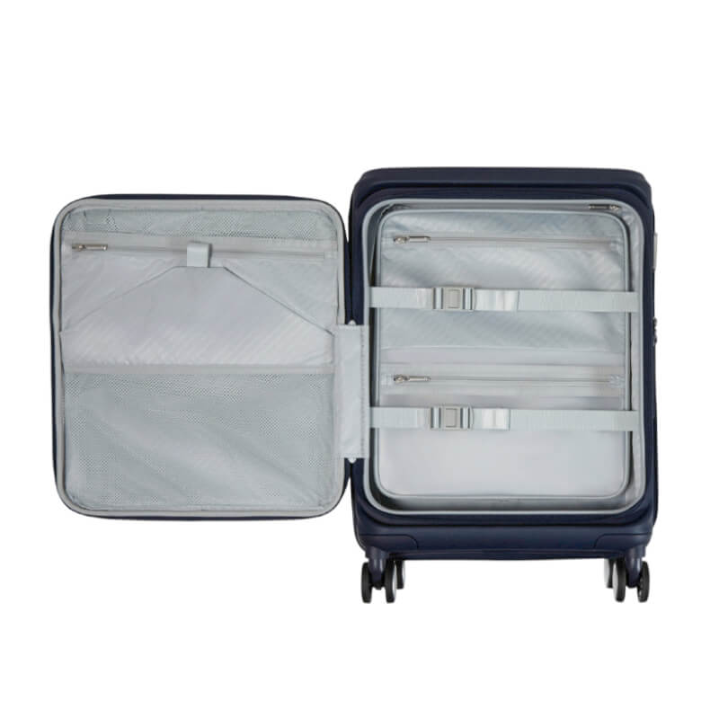 O duplo acesso tanto pelo bolso frontal de abertura rápida como pelo compartimento central torna a organização e o acesso aos seus pertences muito mais práticos. Pode retirar documentos, dispositivos eletrónicos ou artigos de higiene sem ter de abrir toda a mala, o que é ideal para viagens de negócios ou controlos de segurança.