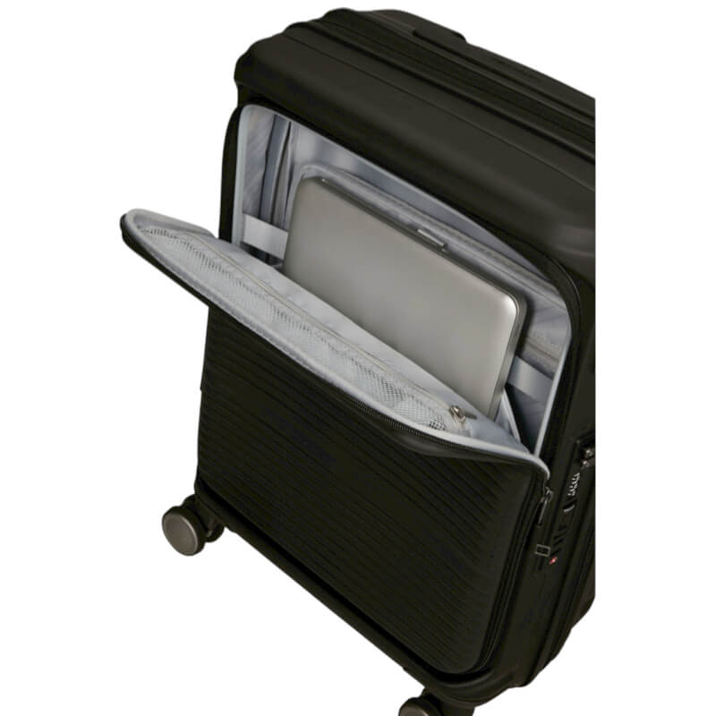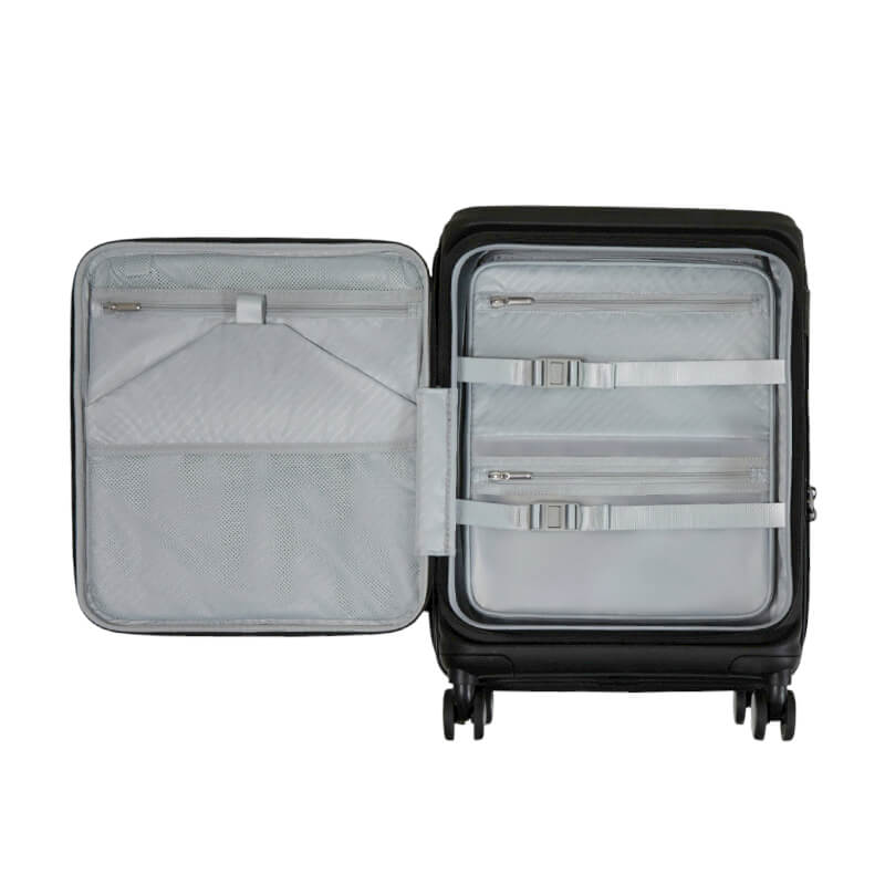 O duplo acesso tanto pelo bolso frontal de abertura rápida como pelo compartimento central torna a organização e o acesso aos seus pertences muito mais práticos. Pode retirar documentos, dispositivos eletrónicos ou artigos de higiene sem ter de abrir toda a mala, o que é ideal para viagens de negócios ou controlos de segurança.