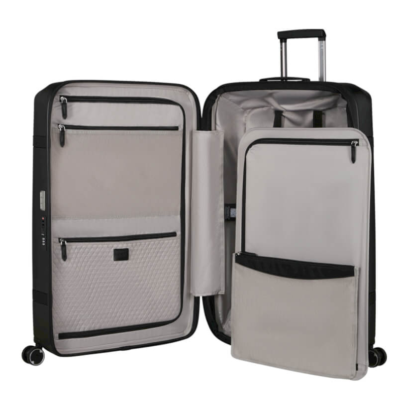 O interior das malas revela um espaço inteligentemente planejado, forrado com materiais luxuosos e de fácil manutenção. As rodas suaves e silenciosas proporcionam uma experiência de deslocamento sem esforço, permitindo que se movimente com leveza e fluidez, independentemente do terreno.