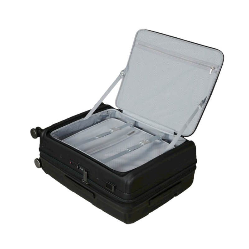 O duplo acesso tanto pelo bolso frontal de abertura rápida como pelo compartimento central torna a organização e o acesso aos seus pertences muito mais práticos. Pode retirar documentos, dispositivos eletrónicos ou artigos de higiene sem ter de abrir toda a mala, o que é ideal para viagens de negócios ou controlos de segurança.