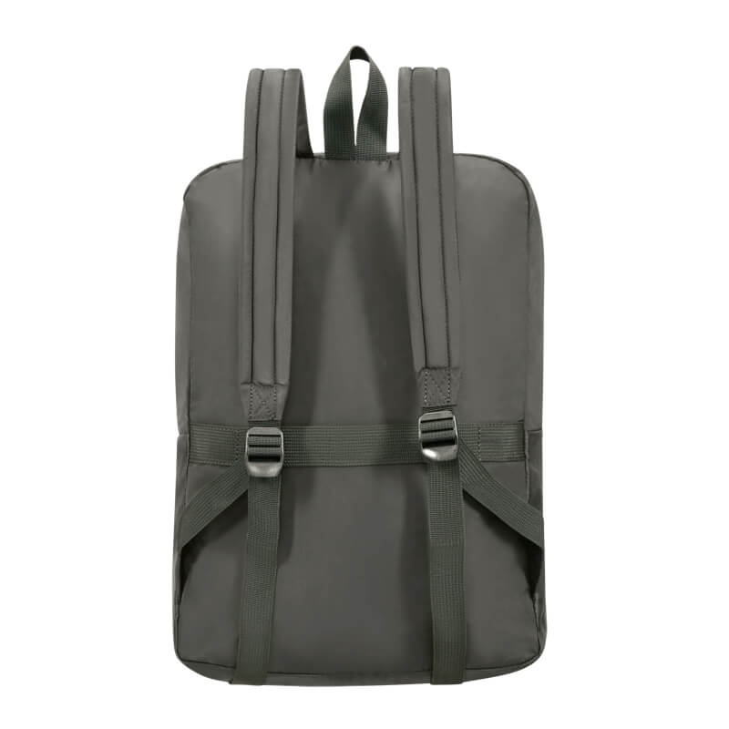 A mochila tem um bolso frontal com fecho, oferecendo acesso rápido a itens essenciais. Na parte traseira, conta com um encaixe para a pega extensível da mala, permitindo adaptar a mochila de forma segura a uma mala de rodas e facilitar o transporte pelo aeroporto ou cidade.