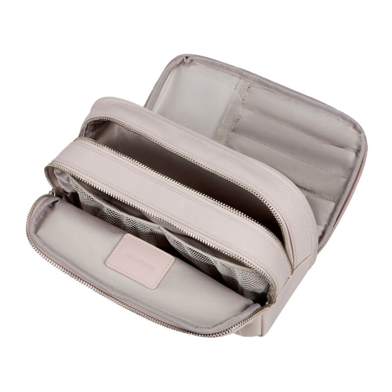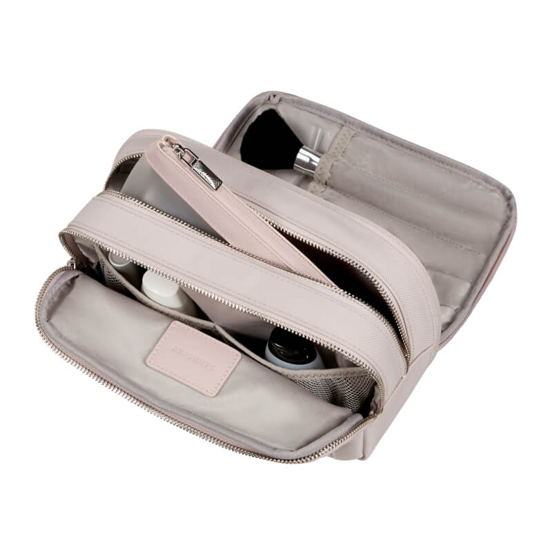 O interior é inteligentemente planeado, com três compartimentos e bolsos que permitem uma arrumação excelente dos seus produtos de higiene e cosméticos. Tudo fica organizado e facilmente acessível, evitando bagunça e tornando o processo de preparação muito mais simples e rápido.