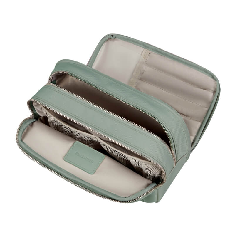 O interior é inteligentemente planeado, com três compartimentos e bolsos que permitem uma arrumação excelente dos seus produtos de higiene e cosméticos. Tudo fica organizado e facilmente acessível, evitando bagunça e tornando o processo de preparação muito mais simples e rápido.