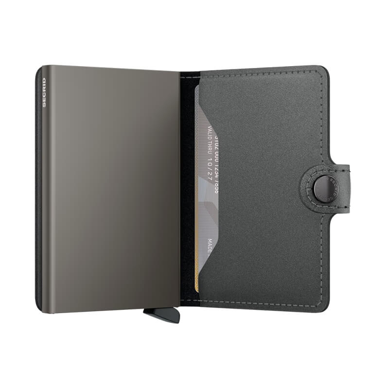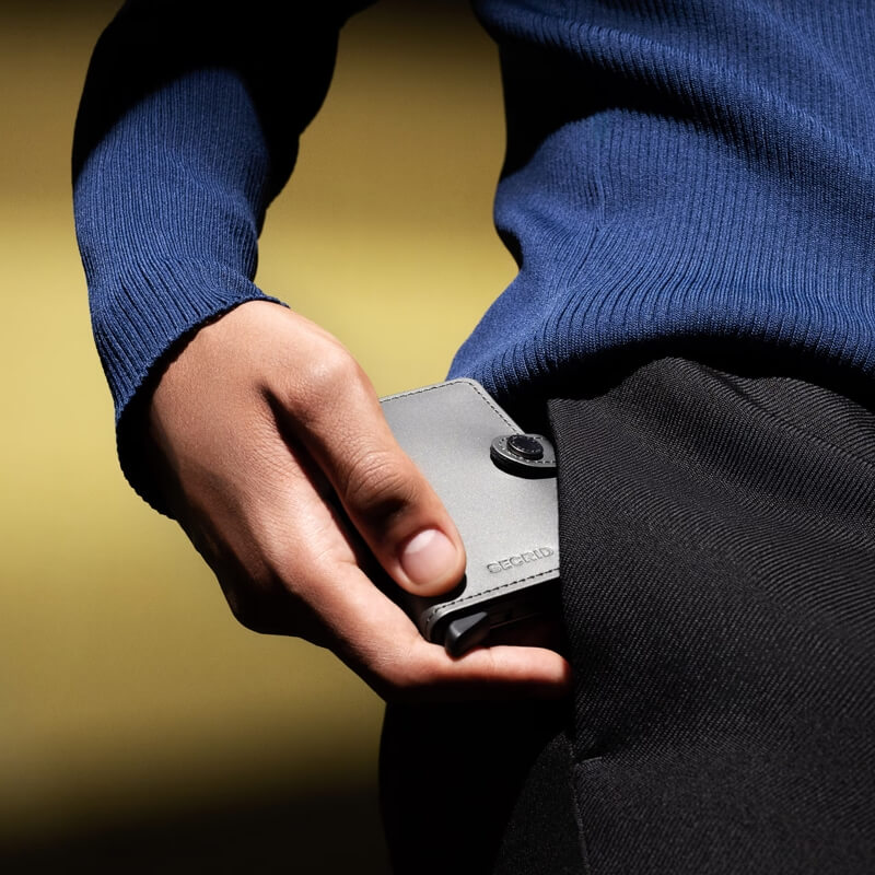 Inspirada no reconhecido Cardprotector da Secrid, a Miniwallet incorpora um compartimento em alumínio com proteção RFID e NFC, que protege eficazmente os cartões contra dobras, quebras e tentativas de leitura sem fios não autorizadas. Com um simples movimento, os cartões deslizam suavemente para fora, garantindo um acesso rápido, intuitivo e seguro.