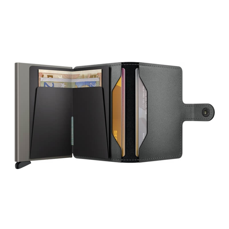 O exterior em material de alta qualidade apresenta um acabamento elegante e resistente, complementado por uma presilha com botão de pressão, que mantém o conteúdo firmemente no lugar. Para além dos cartões, a Miniwallet dispõe ainda de espaço adicional para notas, recibos e cartões suplementares, tornando-a uma solução completa para o uso quotidiano.
