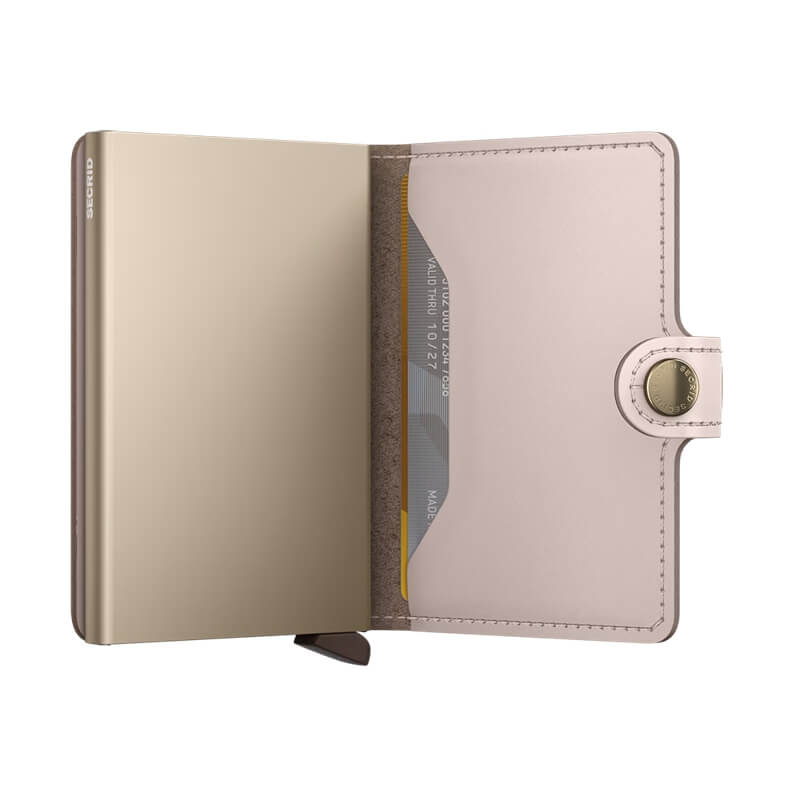 O exterior em material de alta qualidade apresenta um acabamento elegante e resistente, complementado por uma presilha com botão de pressão, que mantém o conteúdo firmemente no lugar. Para além dos cartões, a Miniwallet dispõe ainda de espaço adicional para notas, recibos e cartões suplementares, tornando-a uma solução completa para o uso quotidiano.