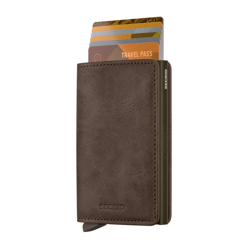 A Slimwallet também é inspirada no inovador Cardprotector da Secrid, integrando um compartimento em alumínio com proteção RFID e NFC. Esta tecnologia protege eficazmente os seus cartões contra dobras, quebras e comunicações sem fios não autorizadas. Com um simples movimento, os cartões deslizam suavemente para fora, garantindo um acesso rápido, prático e seguro.