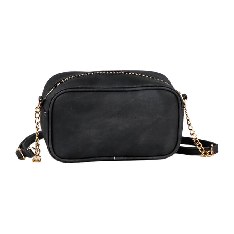 A alça de tiracolo é ajustável e conta com um elegante detalhe em corrente dourada de um dos lados, o que traz ainda mais sofisticação ao acessório. O fechamento com zíper garante segurança aos itens pessoais, tornando a bolsa prática além de estilosa.