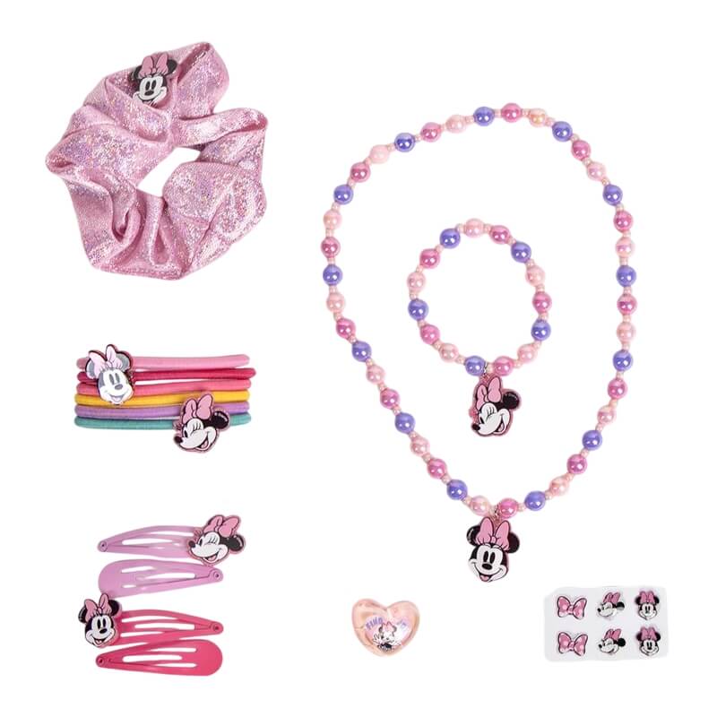 No interior, a criança encontra uma seleção variada de acessórios pensados para transformar qualquer brincadeira num momento especial. O conjunto inclui um scrunchie rosa brilhante, ideal para prender o cabelo com estilo, além de vários elásticos finos coloridos decorados com a Minnie. Também traz molas de cabelo, sendo duas delas com aplique da personagem, perfeitos para completar penteados divertidos.