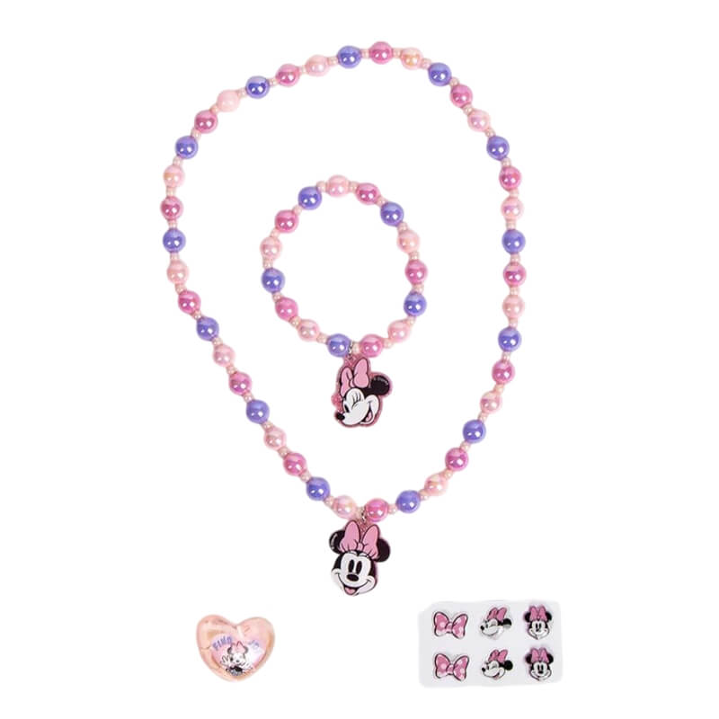 Para complementar o look, o set oferece ainda um colar e uma pulseira em tons rosa, lilás e roxo, ambos com um bonito pendente da Minnie. Há também um anel em forma de coração com a personagem, adicionando um toque extra de brilho às brincadeiras. Para finalizar, também trás adesivos da Minnie que podem ser usados para decorar cadernos, brinquedos ou qualquer superfície que a imaginação permitir.