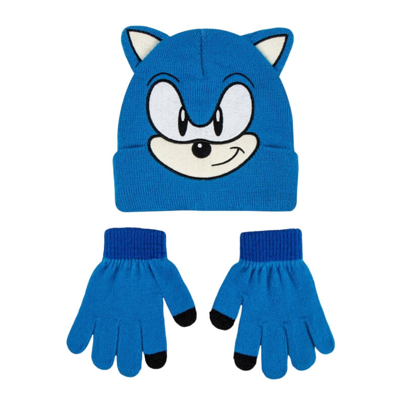 Este conjunto infantil é inspirado no famoso personagem Sonic, o ouriço azul dos videogames da SEGA. Ele é composto por um gorro e um par de luvas, ambos num tom vibrante de azul que remete diretamente ao visual icónico do personagem.