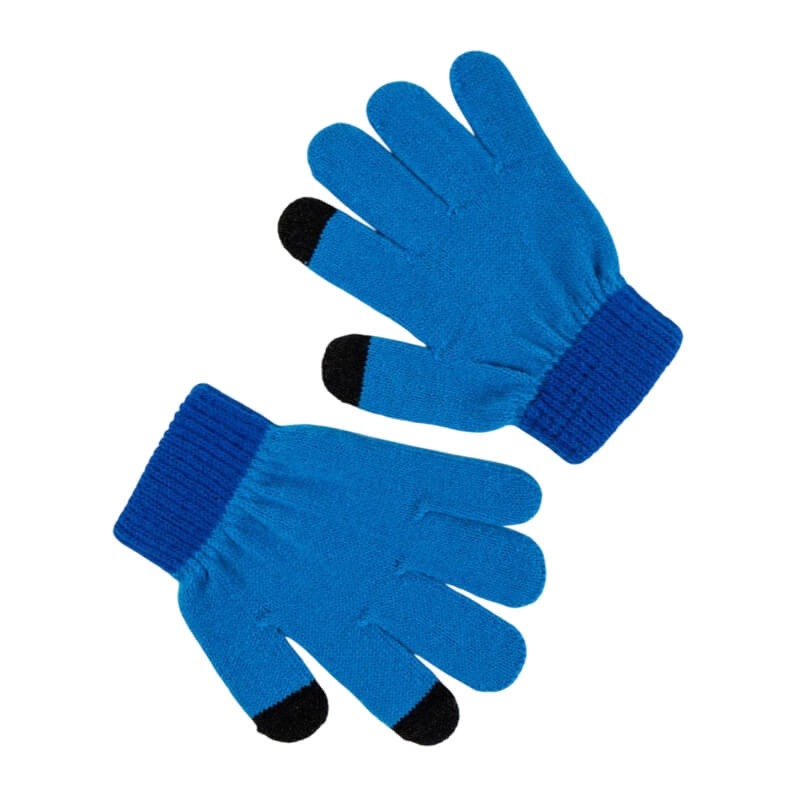 As luvas que acompanham o conjunto seguem o mesmo tom de azul do gorro e possuem punhos em azul escuro para um leve contraste. As pontas dos dedos polegar e indicador são pretas, o que pode indicar compatibilidade com telas sensíveis ao toque. As luvas são confortáveis, quentinhas e ideais para o uso diário no inverno.