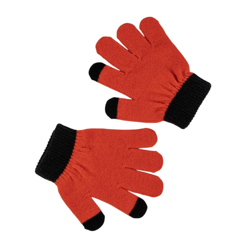 As luvas acompanham o mesmo esquema de cores do gorro: são predominantemente vermelhas, com punhos e pontas dos dedos em preto, criando um visual harmonioso e combinando perfeitamente com o tema. Elas são elásticas e ajustam-se bem às mãos das crianças, mantendo-as aquecidas durante o inverno.