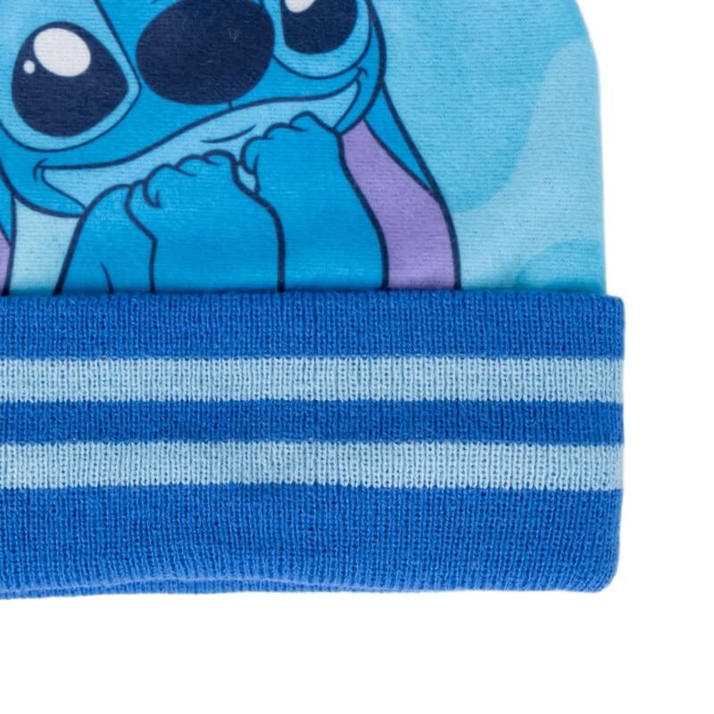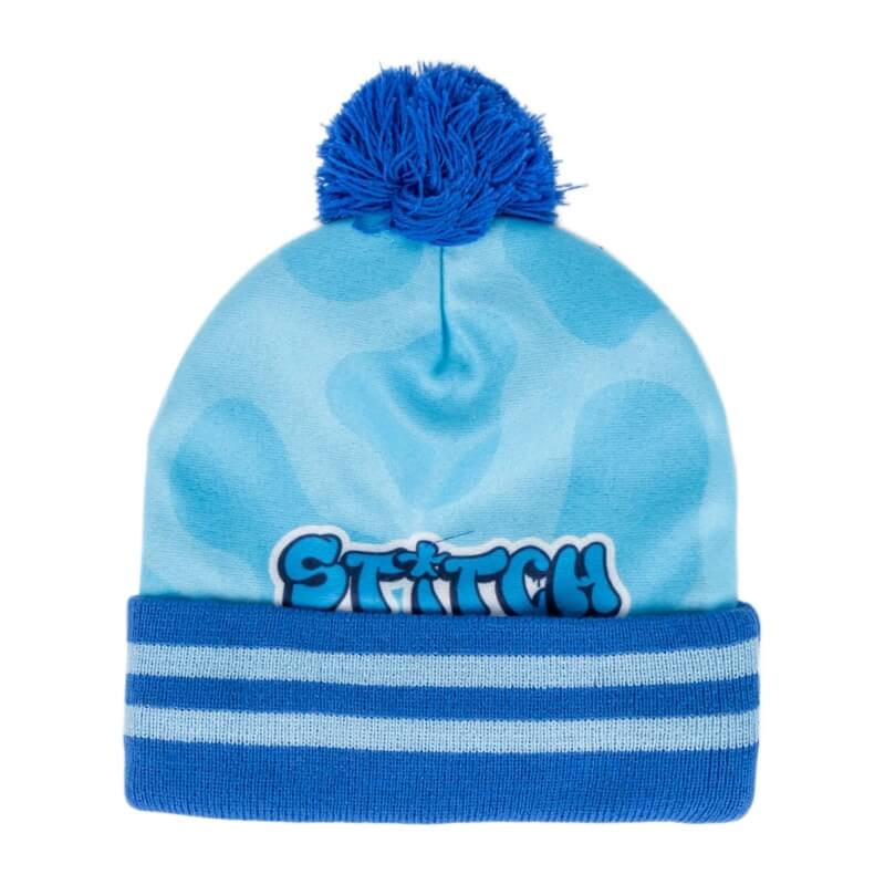 O gorro tem um design alegre, com a cara do Stitch em destaque sobre um fundo azul, adicionando um toque especial para os fãs do personagem.