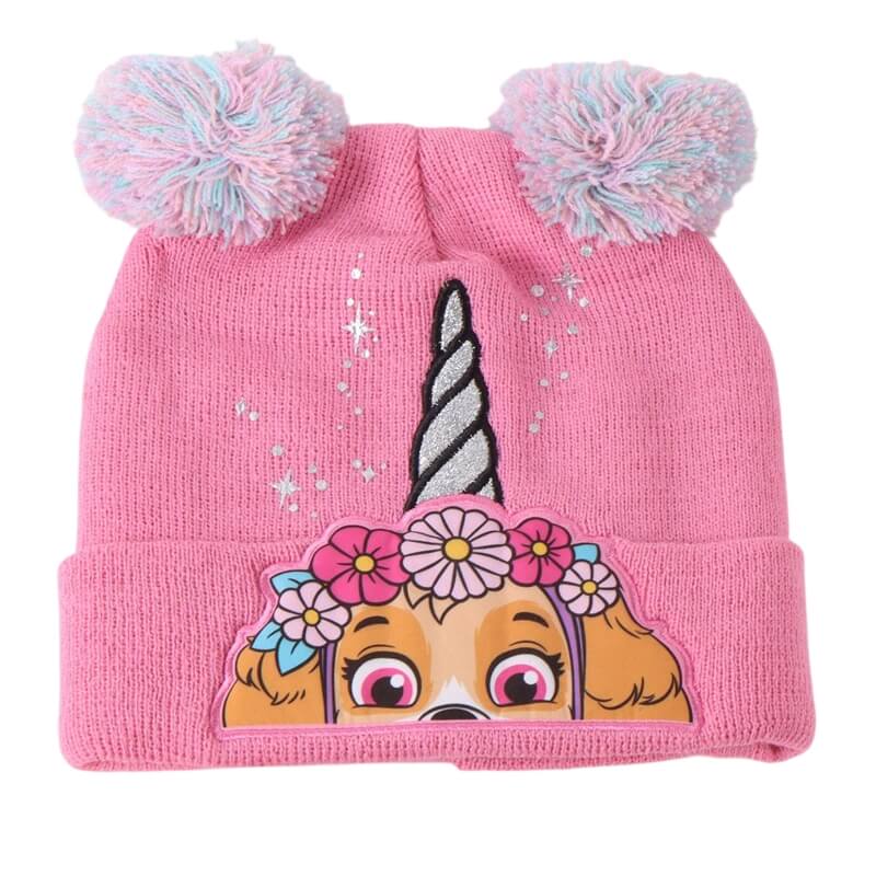 O conjunto inclui um gorro rosa com dois pompons coloridos no topo, que dão um toque divertido e fofo. Na parte frontal, destaca-se a imagem da Skye com uma tiara de flores e um chifre de unicórnio, combinando o charme da personagem com um toque mágico e fantasioso.