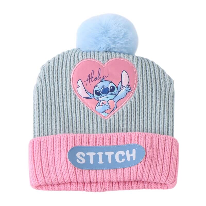 O gorro tem um design alegre, com pompom azul no topo e uma faixa rosa na base com a palavra STITCH em destaque sobre um fundo azul. Na parte frontal, há um aplique em formato de coração com a imagem do Stitch e a palavra Aloha, adicionando um toque especial para os fãs do personagem.