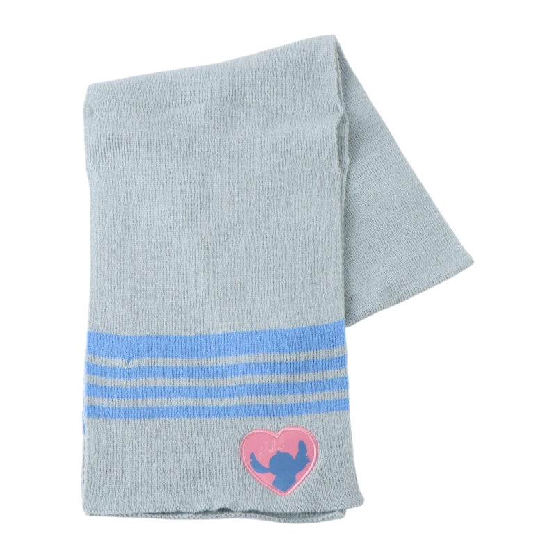 O cachecol segue o mesmo tom verde-claro e possui listras azuis em uma das extremidades. Como detalhe adicional, há um coração rosa com a silhueta do Stitch, combinando com o estilo do gorro e reforçando o tema do personagem. As luvas complementam o conjunto com perfeição. Também em verde-claro, elas têm punhos com listras rosa e azul, além de um desenho de coração azul com a silhueta do Stitch estampado em cada mão.