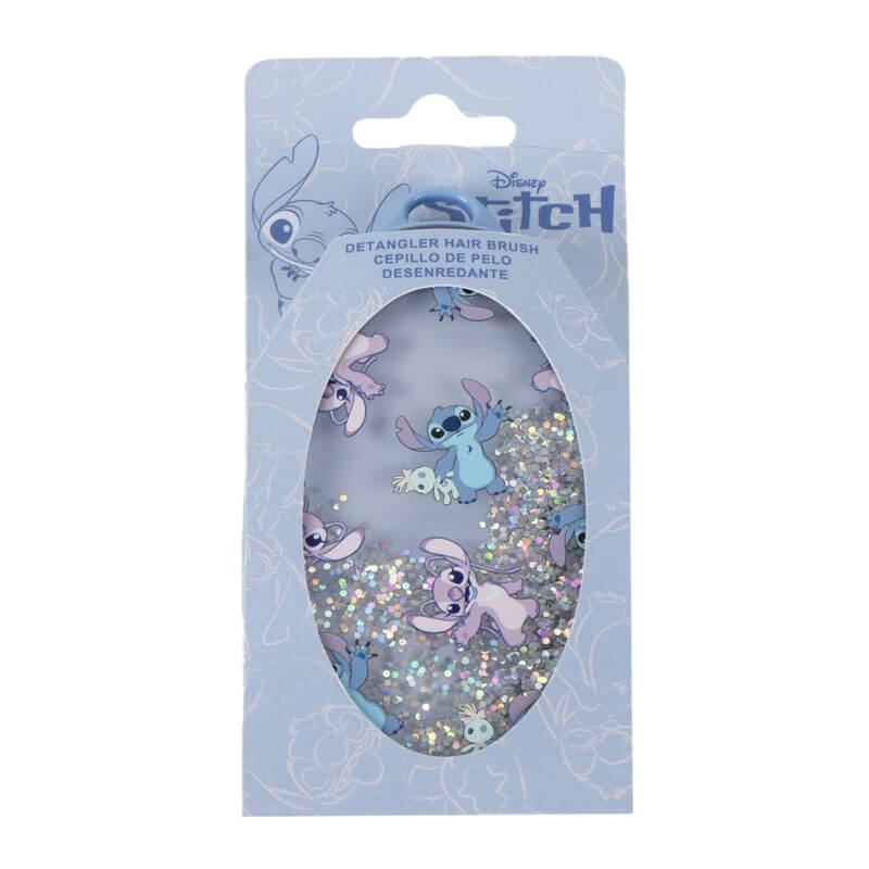 Esta é uma escova de cabelo com um design inspirado no personagem Stitch, da Disney. O formato da escova é oval e possui uma moldura azul clara. A parte de trás apresenta um líquido com glitter prateado que se move, criando um efeito brilhante e divertido. Dentro desse líquido, há várias ilustrações coloridas do Stitch e da Angel, em tons de azul e rosa, em diferentes poses alegres.