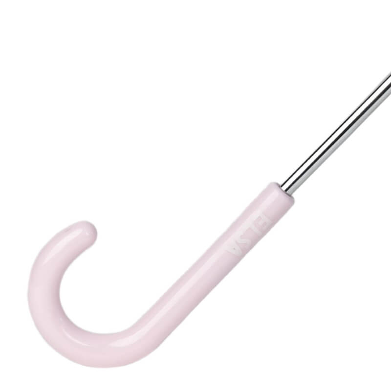 O formato oferece uma cobertura mais ampla, protegendo bem os ombros e a cabeça da criança, mesmo em dias de vento. O cabo em formato de gancho em rosa claro, é ergonómico e fácil de segurar, ideal para mãos pequenas. Além disso, o fechamento manual com presilha de velcro permite que a criança use o guarda-chuva com segurança e autonomia.