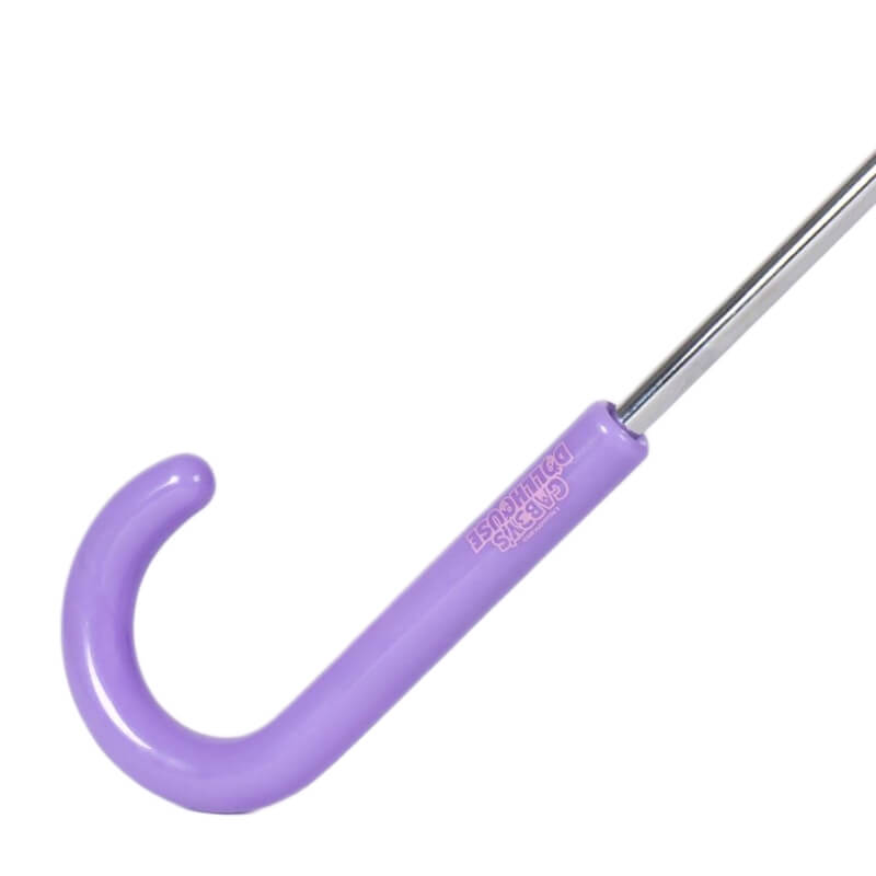 O formato oferece uma cobertura mais ampla, protegendo bem os ombros e a cabeça da criança, mesmo em dias de vento. O cabo em formato de gancho, na cor lilás, é ergonómico e fácil de segurar, ideal para mãos pequenas. Além disso, o fechamento manual com presilha de velcro permite que a criança use o guarda-chuva com segurança e autonomia.