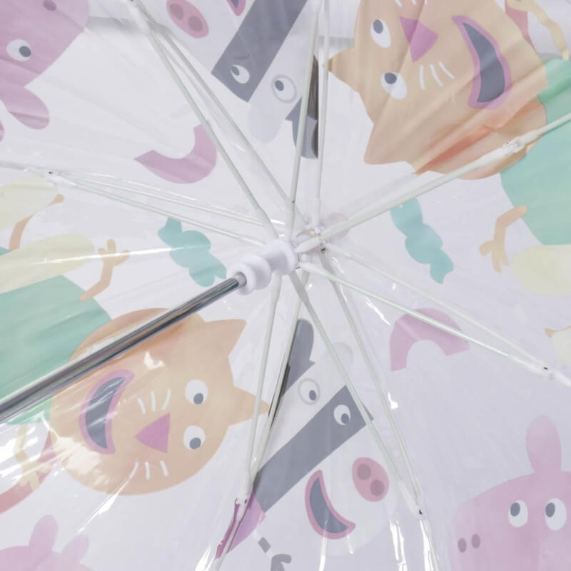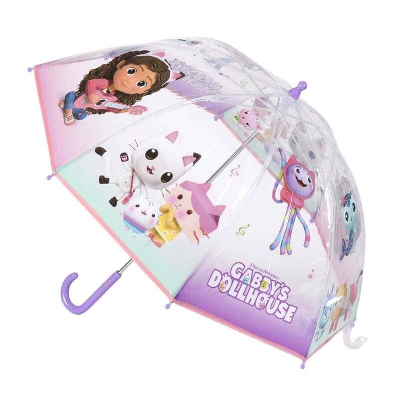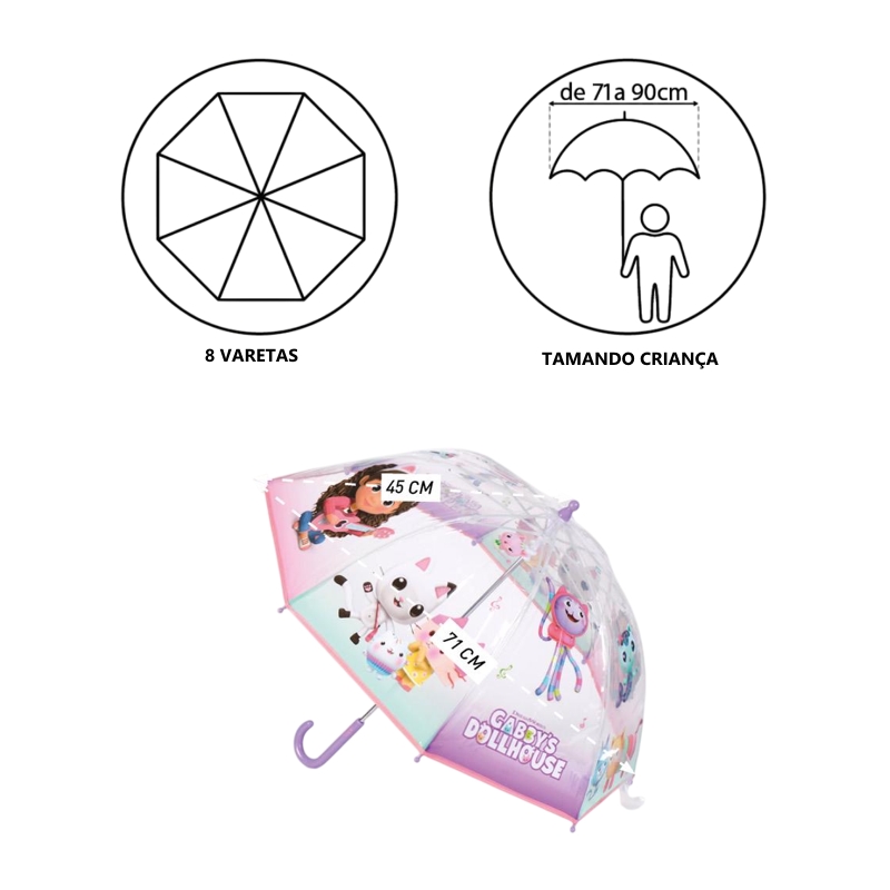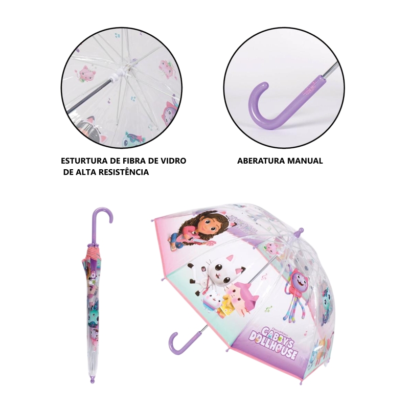 Feito com material transparente, o guarda-chuva permite maior visibilidade para os pequenos, garantindo segurança durante o uso. A estampa colorida traz diversas personagens da série Gabby's Dollhouse em tons lilás, sobre um fundo transparente, criando um visual divertido e delicado que conquista meninas de todas as idades.