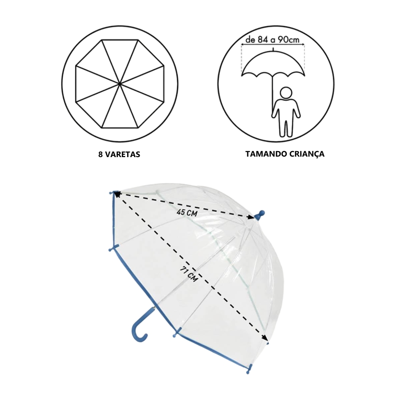 O formato oferece uma cobertura mais ampla, protegendo bem os ombros e a cabeça da criança, mesmo em dias de vento. O cabo em formato de gancho, na cor vermelha, é ergonómico e fácil de segurar, ideal para mãos pequenas. Além disso, o fechamento manual com presilha de velcro permite que a criança use o guarda-chuva com segurança e autonomia.