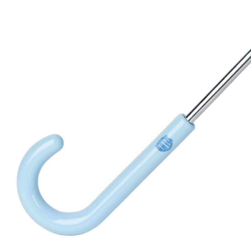 O formato oferece uma cobertura mais ampla, protegendo bem os ombros e a cabeça da criança, mesmo em dias de vento. O cabo em formato de gancho em azul, é ergonómico e fácil de segurar, ideal para mãos pequenas. Além disso, o fechamento manual com presilha de velcro permite que a criança use o guarda-chuva com segurança e autonomia.