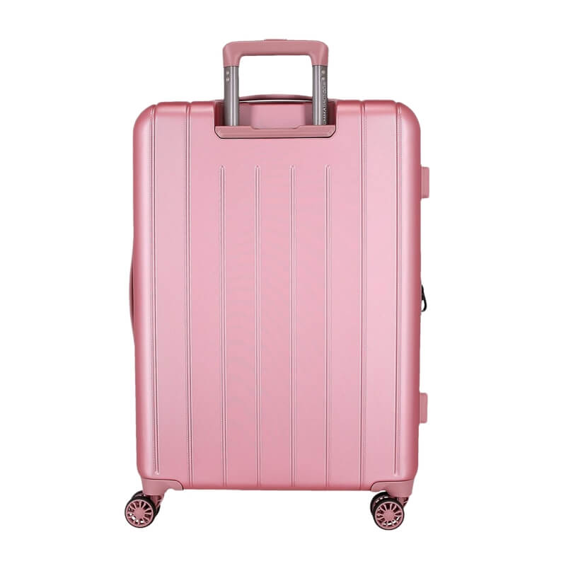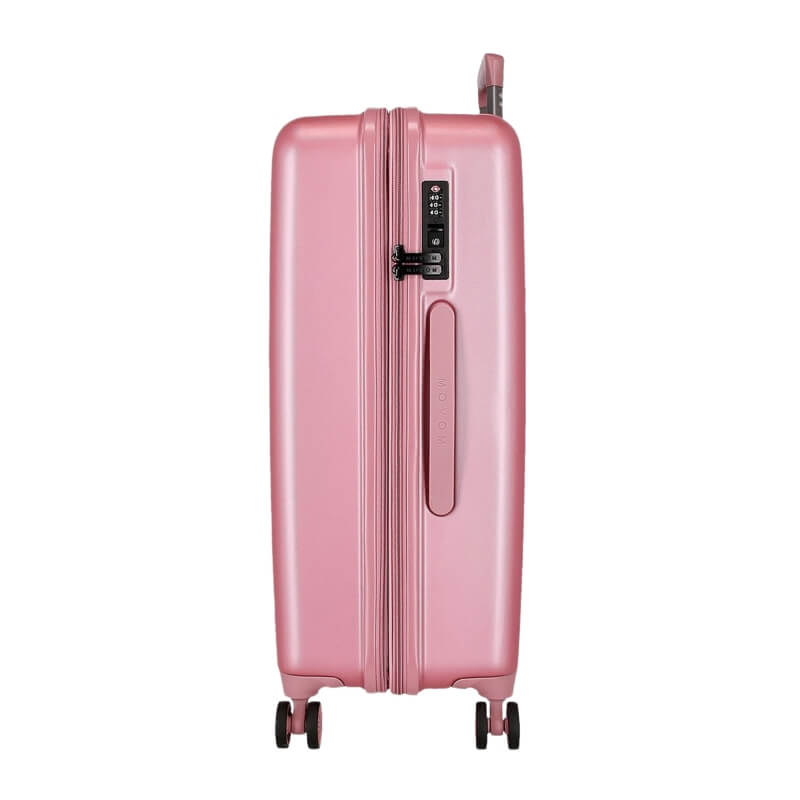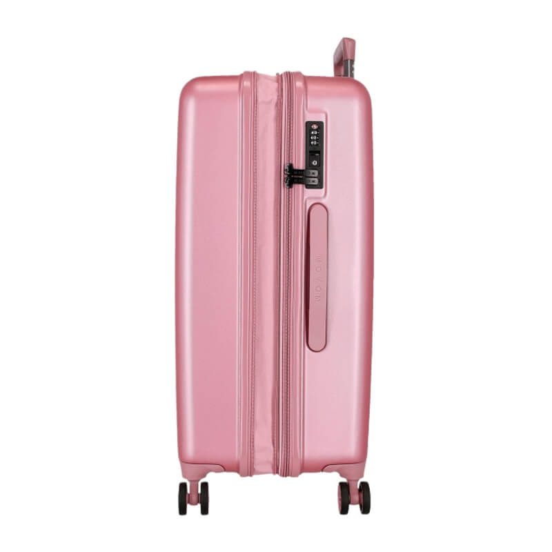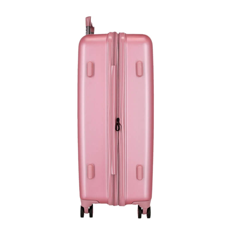 A mala de média 65cm da Minnie combina charme, funcionalidade e um design irresistível, ideal para quem viaja com estilo. Com um acabamento em rosa metalizado, apresenta uma ilustração elegante da Minnie Mouse acompanhada de detalhes em padrão de bolinhas e a mensagem Love, Happiness and Bows, transmitindo alegria e personalidade. Fabricada em material rígido resistente, esta mala protege eficazmente os seus pertences durante a viagem.