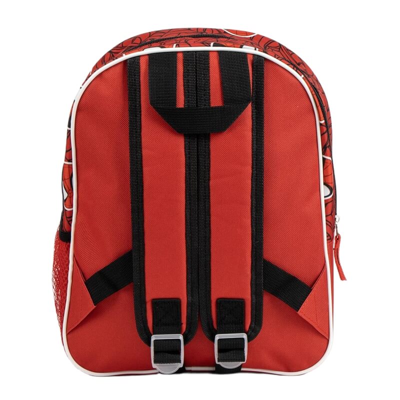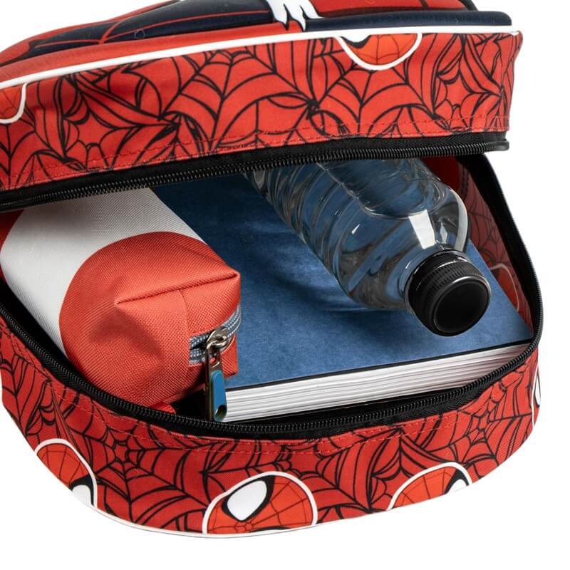 O corpo da mochila apresenta laterais e costas em vermelho, com estampas de teias que complementam o tema. O compartimento principal possui bom espaço para transportar livros, brinquedos, lanches e outros materiais do dia a dia, enquanto o zíper resistente garante abertura e fecho seguros. Nas laterais, um bolso em rede oferece praticidade para levar garrafa ou pequenos objetos.