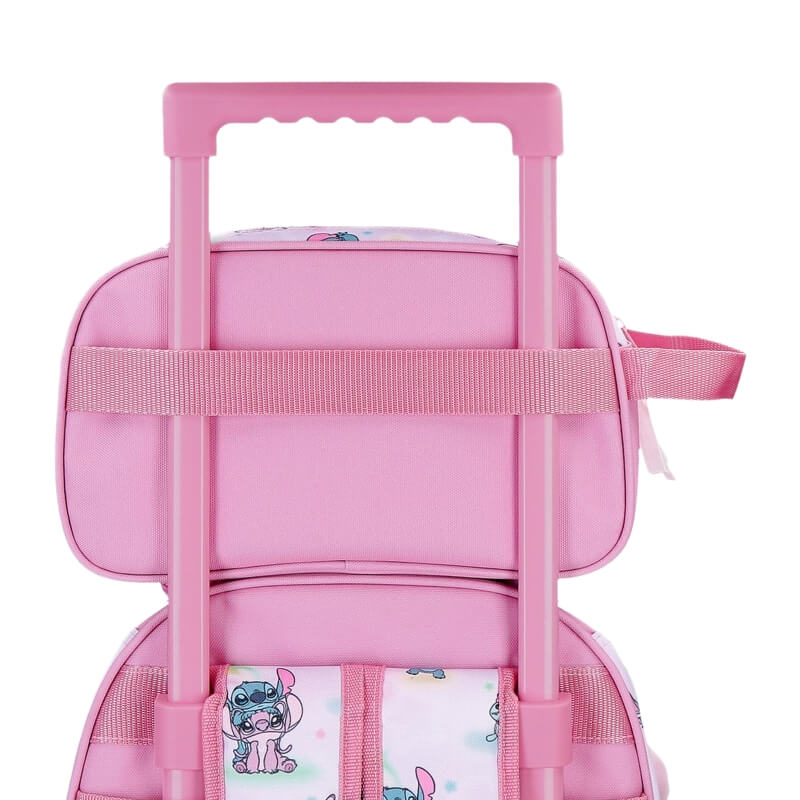 A coleção Stitch You & Me aposta num estilo doce e romântico, com fundo em tons malva e rosa pastel, estampado com várias ilustrações pequenas do Stitch. O destaque fica para o Stitch em versão fofa no painel frontal, rodeado por estrelas e detalhes coloridos, criando um visual leve, divertido e cheio de ternura.