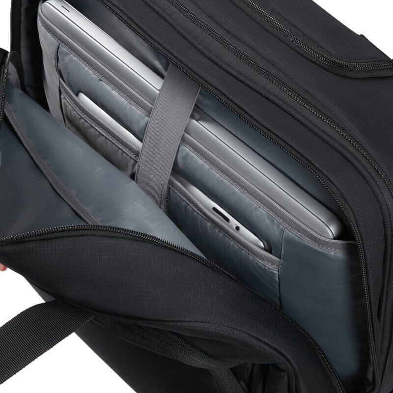 Fabricada em material têxtil resistente, esta pasta oferece durabilidade e proteção para os objetos transportados. O compartimento principal é espaçoso e adequado para guardar um computador portátil, documentos no formato A4 e outros acessórios essenciais de trabalho, mantendo tudo devidamente organizado. Na parte frontal, dispõe ainda de vários bolsos com fecho que permitem acesso rápido a objetos mais pequenos, como carregadores, telemóvel, cartões ou material de escritório.