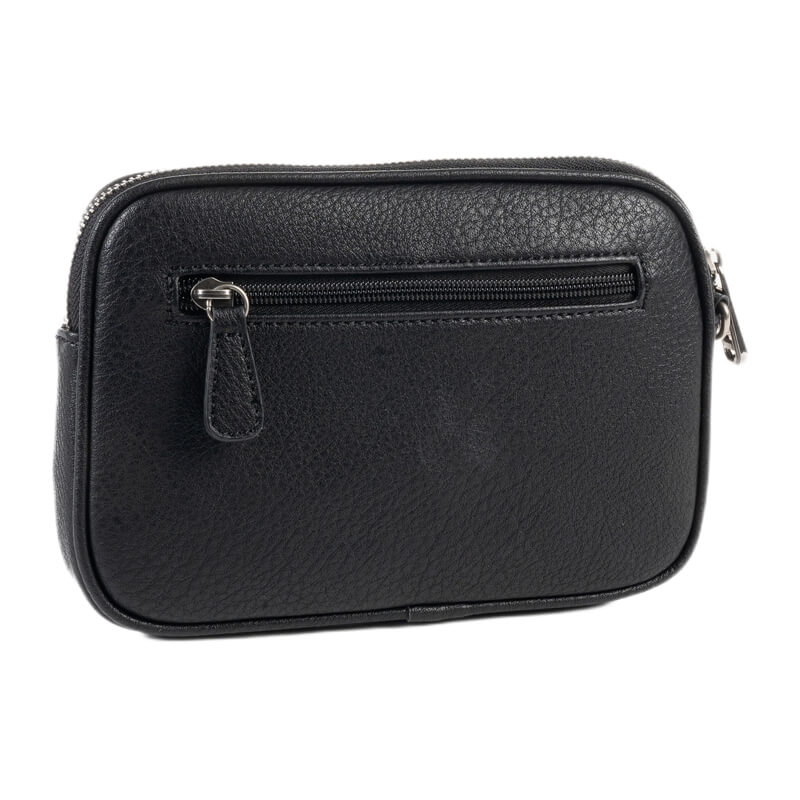 A bolsa tem um formato compacto e funcional, é perfeita para transportar objetos essenciais como telemóvel, carteira, chaves ou documentos pequenos. Possui um bolso frontal e outro na parte de trás, ambos com fecho de correr, que facilitam o acesso rápido aos itens mais usados, e um compartimento principal também com fecho, garantindo segurança e organização.