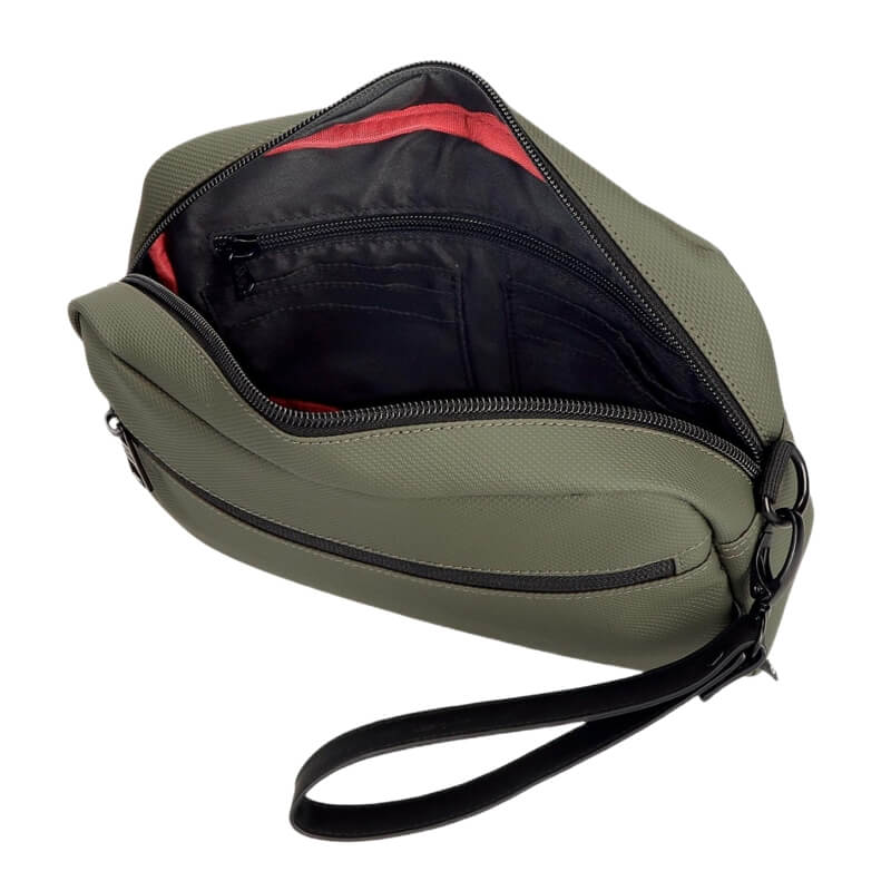 Através do uso de materiais de alta qualidade, funcionalidade e conforto, a coleção visa proporcionar uma experiência agradável e confiável. Esta bolsa de mão tem no interior, vários slots para cartões e bolsos de tamanhos diferentes, um deles com fecho de correr. Permitindo que mantenha cartões, documentos e moedas organizados e separados, facilitando o acesso rápido quando necessário.