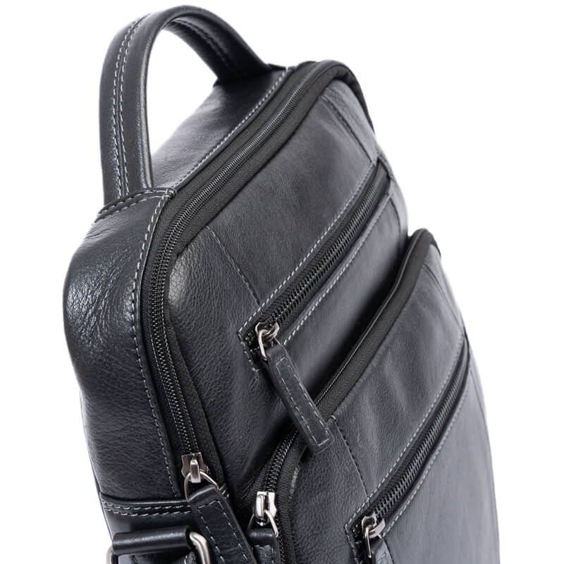 O seu formato vertical e estruturado oferece amplo espaço interno, distribuído em vários compartimentos com fecho de correr, perfeitos para transportar documentos, carteira, telemóvel e outros objetos pessoais de forma segura e organizada. Além disso tem três bolsos na parte frontal, um deles com organizador interno e outro na parte de trás. Estes bolsos são perfeitos para guardar pequenos objetos de acesso rápido.