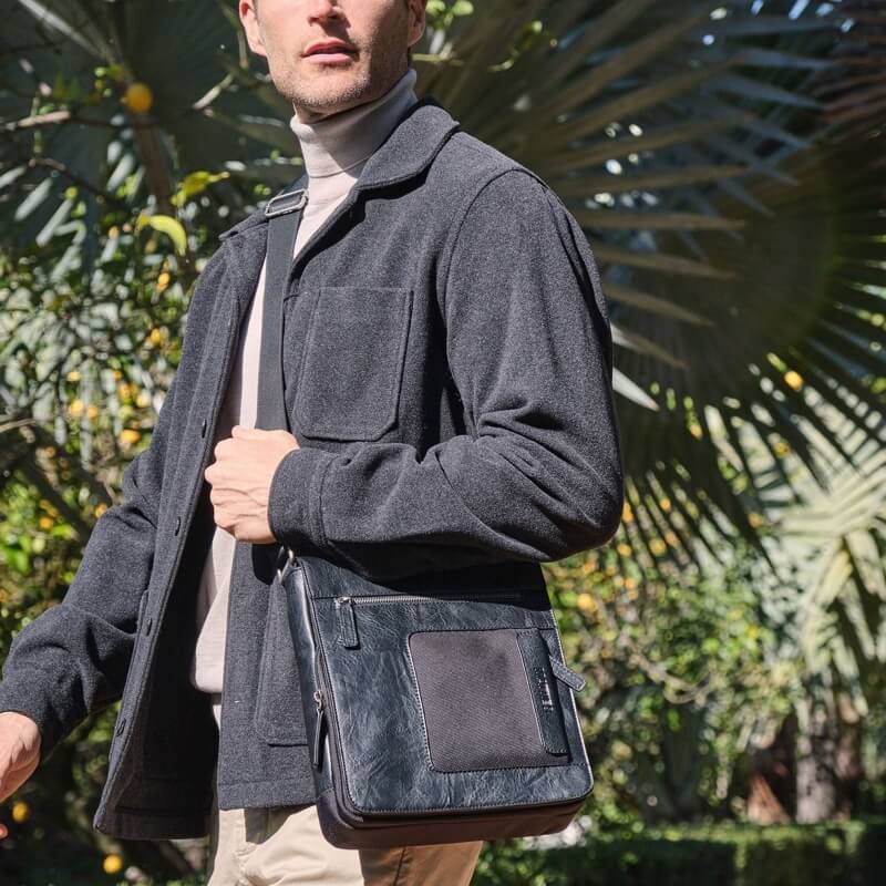 A bolsa tem um formato compacto e funcional, é perfeita para transportar objetos essenciais como telemóvel, carteira, chaves ou documentos pequenos. Além disso, tem um compartimento para transportar um tablet até 10.2" em segurança. Também, sob a aba dispõe de bolsos frontais e um bolso traseiro, perfeitos para manter documentos, telemóvel, carteira e outros objetos pessoais sempre bem organizados e acessíveis.