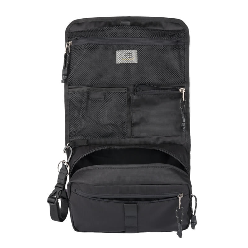 Com um interior inteligentemente dividido, esta bolsa dispõe de vários bolsos e compartimentos, incluindo bolsos em rede e um com fecho, que permitem organizar produtos de higiene e cosméticos de forma clara e acessível. Tudo fica visível e bem separado, facilitando a utilização mesmo em espaços reduzidos.