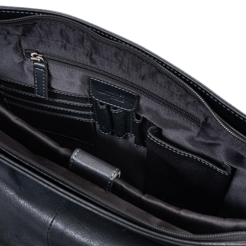 Dispõe ainda de um bolsos frontal e outro traseiro com fecho de correr, que facilitam o acesso rápido a objetos de uso frequente. Os zíperes metálicos, as costuras reforçadas e o tom preto clássico conferem-lhe um visual profissional, tornando esta pasta a companheira perfeita para o dia a dia de trabalho ou viagens de negócios.