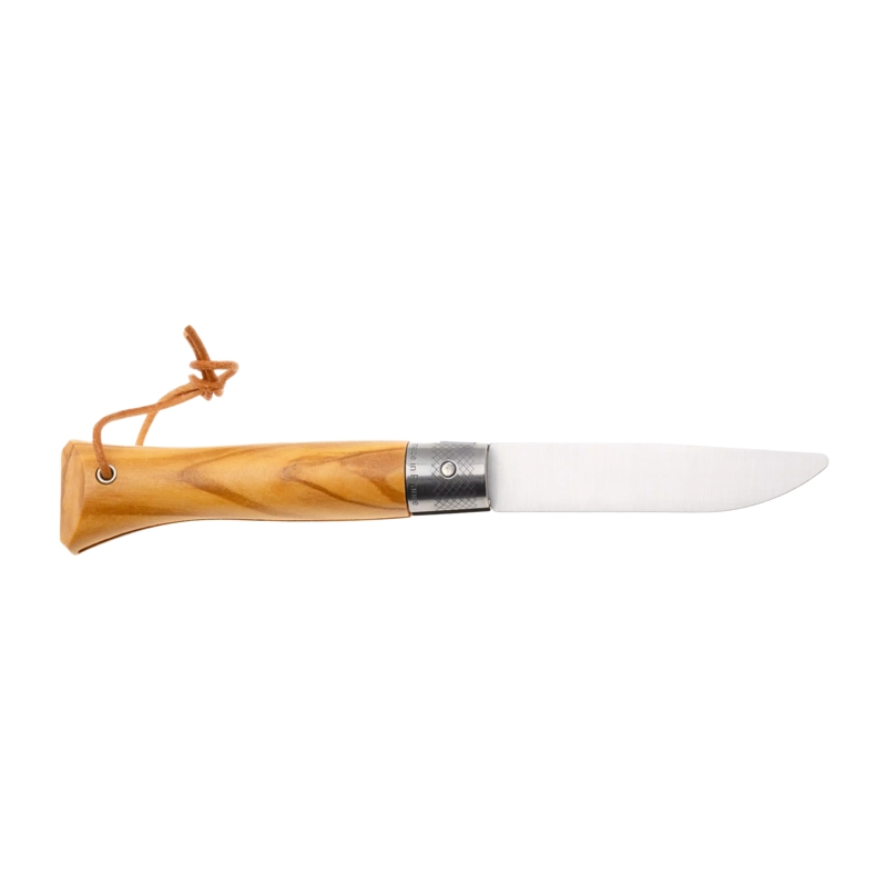 O cabo em madeira de oliveira destaca-se pela sua tonalidade escura e sofisticada, proporcionando um toque natural, confortável e uma pega firme mesmo em utilizações prolongadas. Como detalhe funcional, a tira de couro acrescenta praticidade, permitindo prender o canivete facilmente a mochilas, cintos ou outros pontos acessíveis, evitando perdas e facilitando o transporte.