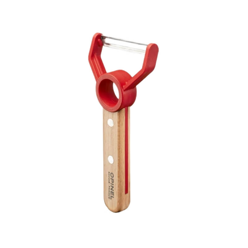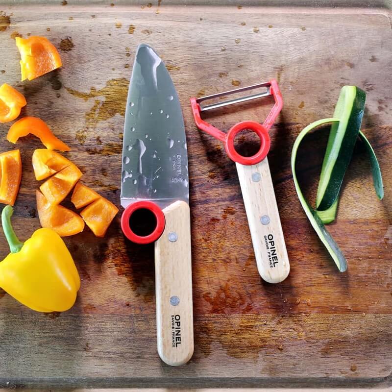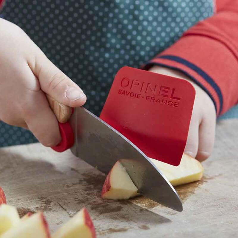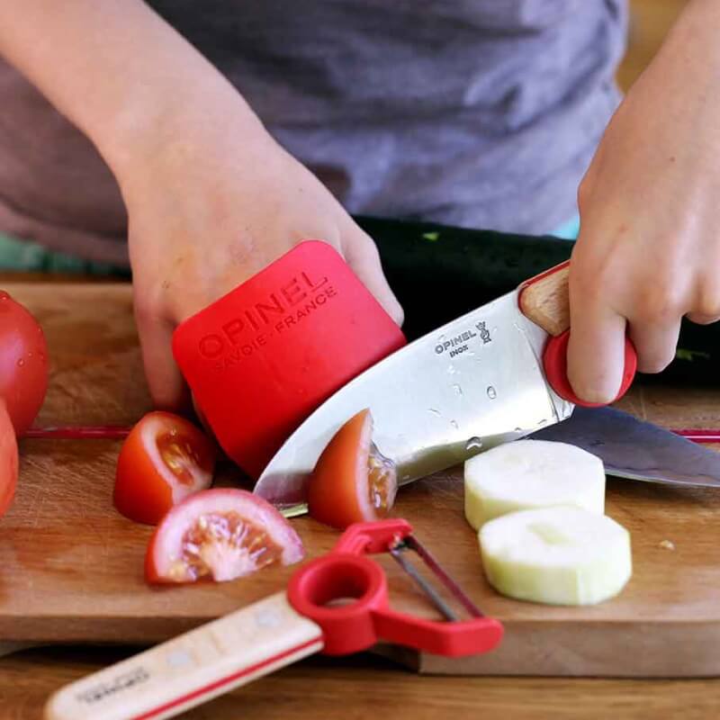 Este conjunto inclui uma faca, um descascador e um protetor de dedos em vermelho. A faca e o descascador estão equipados com um anel de treino, que ajuda a posicionar corretamente os dedos, promovendo gestos seguros desde o início. O protetor de dedos foi concebido para proteger a mão que segura o alimento, reduzindo o risco de cortes durante a utilização.