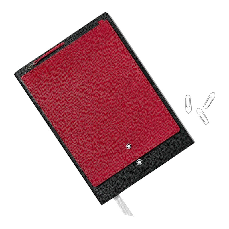 Enriqueça a coleção Fine Stationery com um bolso removível. O bolso removível de couro Saffiano vermelho com uma banda elástica prática posicionada na parte frontal da capa também pode ser usada como um acessório separado para levar o telemóvel, instrumentos de escrita ou cartões de negócio. Este bloco de notas Montblanc é um acessório bastante útil para andar sempre consigo. A capa é de couro bezerro italiano, curtido a crómio, tingido, com padrão Saffiano e papel de alta qualidade de 85 g/m². Com 96 folhas / 192 páginas, todas contém marca d' água do emblema da Montblanc.