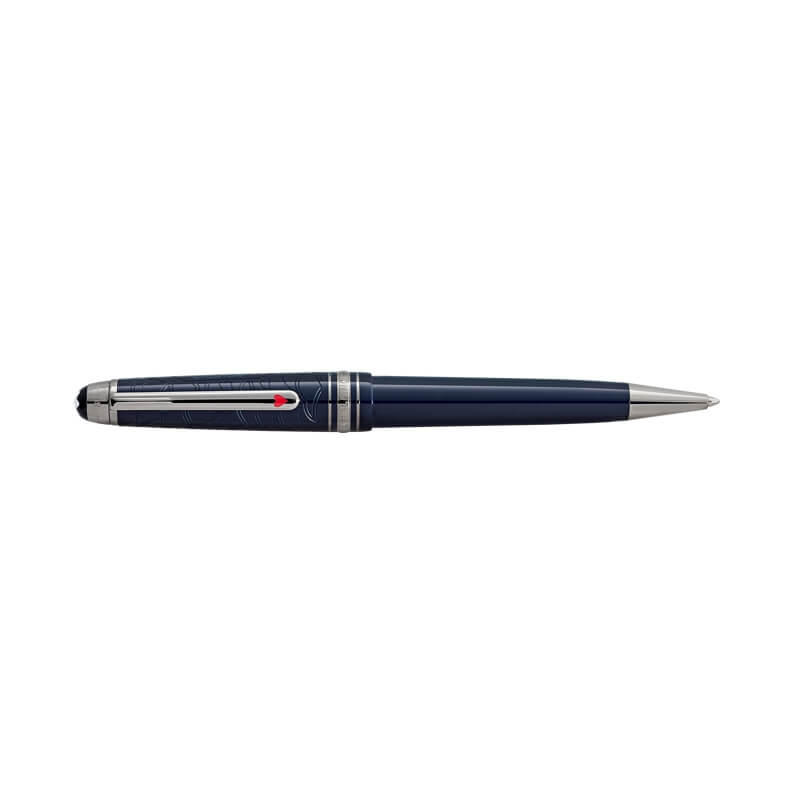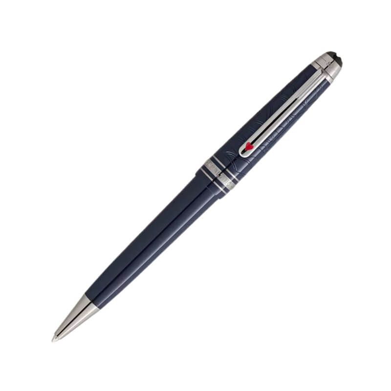 Feita em resina preciosa num sofisticado tom azul profundo, a caneta apresenta delicadas gravações que evocam o movimento das ondas do mar, remetendo para a travessia marítima descrita na história. Os detalhes em acabamento platinado acrescentam contraste e requinte, enquanto o clip exibe um pequeno coração vermelho, uma referência subtil ao naipe de copas e à aposta que impulsiona toda a aventura.