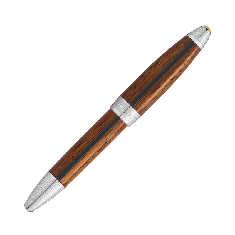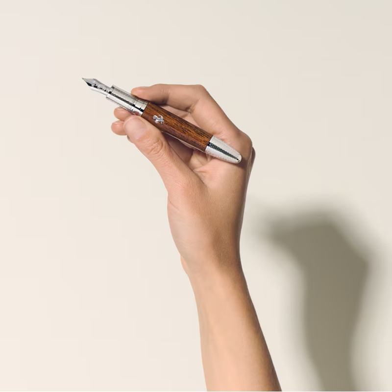 O corpo e a tampa são produzidos em madeira de sapeli, material nobre que confere calor e autenticidade à peça, complementado por um elegante detalhe em lacado preto e pelo inconfundível cavalo empinado da Ferrari. O resultado é um instrumento de escrita que alia performance, luxo e paixão automóvel, concebido para verdadeiros apreciadores de design e exclusividade.