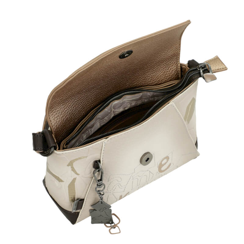 Esta bolsa de tiracolo foi projetada para oferecer praticidade sem abrir mão do estilo. Conta com dois compartimentos distintos, ideais para separar e organizar os teus pertences do dia a dia de forma eficiente. No interior, apresenta bolsos adicionais, sendo um deles equipado com fecho para manter objetos pequenos, como chaves, cartões ou moedas, em total segurança.